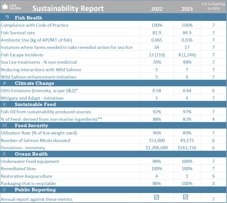 The Canadian farm-raised salmon sector has extensive public reporting in place, via company-level annual reports (including ESG reports), through third-party certifications and through federal and provincial regulations. The industry is working together to aggregate performance to create additional transparency on progress.